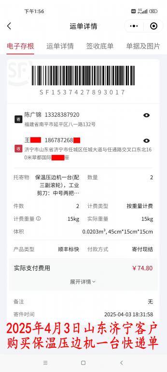4月3日濟寧客戶快遞單